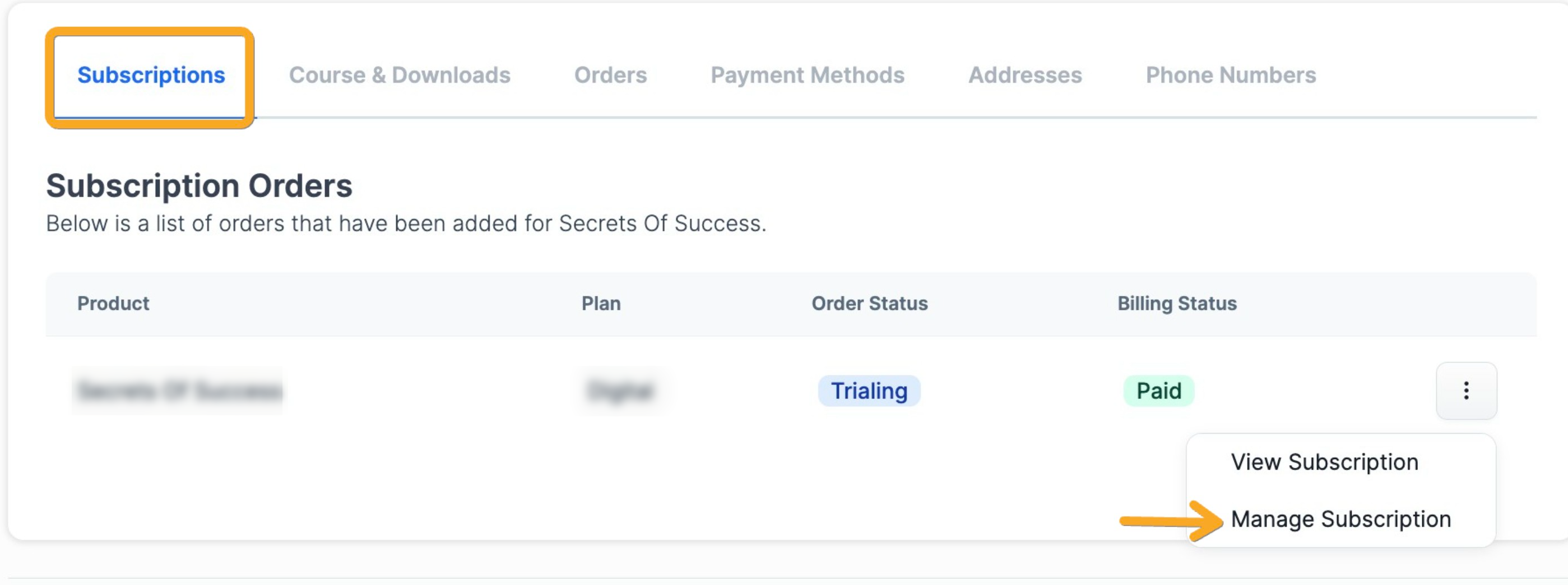 2. Under subscriptions, go to your active/trialing Understand.Me subscription you would like to cancel, click those 3 dots, and click on manage subscription.