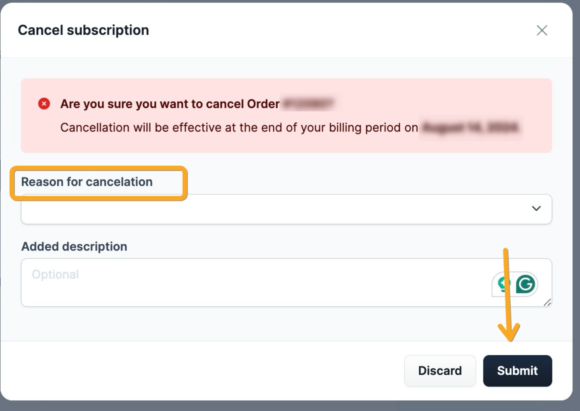 4. Select reason for cancelling dropdown menu, cancellation description if any, and click submit.